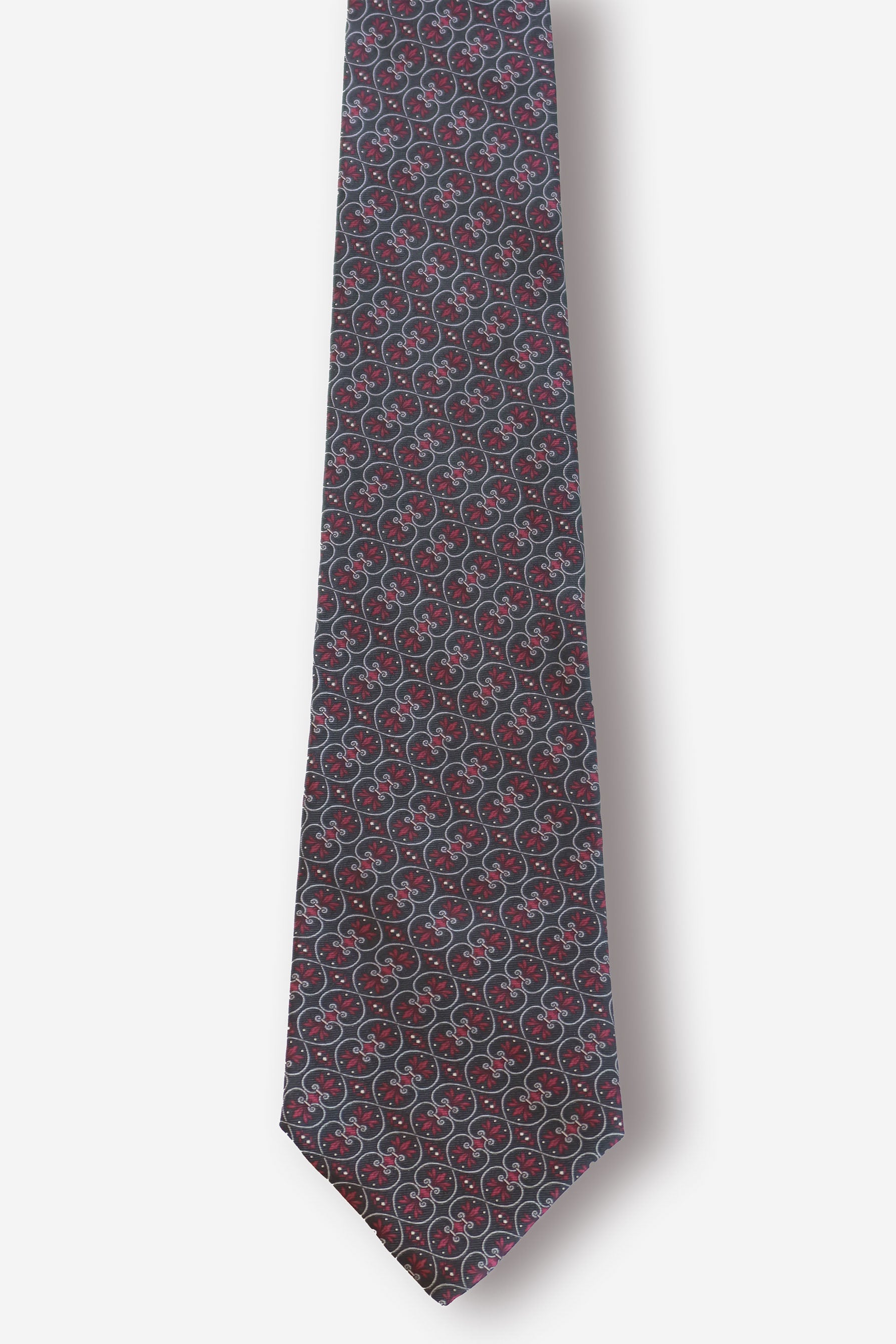 This Christian Dior tie reflects the maison’s ability to merge French sophistication with global craftsmanship. The silk, woven in Italy, carries a refined quatrefoil motif enlivened by red floral accents against a charcoal ground, offering a balance of structure and ornamentation. It represents an era when Dior sought to extend its luxury codes into ready-to-wear and accessories. Subtle yet intricate, this tie is a testament to the enduring elegance of Dior’s aesthetic.
